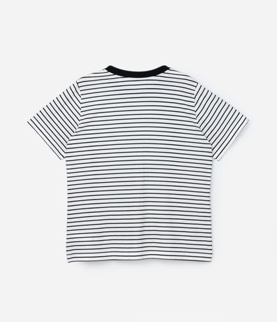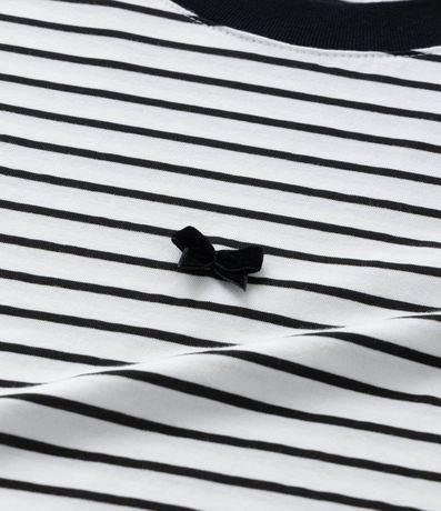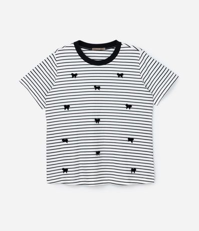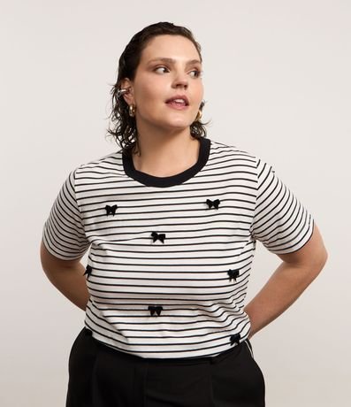 Ref: Blusa feminina Curve & Plus Size, confeccionada em algodão mais sustentável com boas práticas ambientais, peça com gola redonda contrastante, listras finas horizontais, manga curta e aplicação de lacinhos.