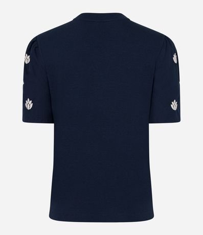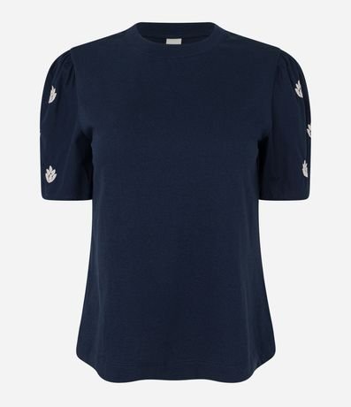 Ref: Blusa feminina confeccionada em algodão, com gola redonda e manga bufante com bordado floral.