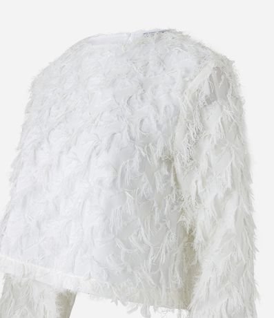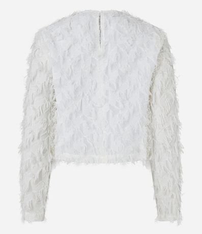 Blusa com comprimento mais curto com gola redonda, mangas longas e pelinhos em formato de franjinhas por toda a peça.