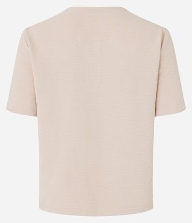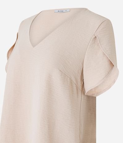 Blusa de mangas curtas confeccionado em tecido airflow com visual amassado e decote V. Possui mangas tulipas, que são mangas com transpasse. Este produto possui poléster recilado em sua composição, sendo ambientalmente mais responsável.