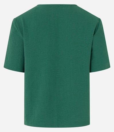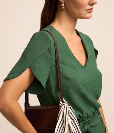 Blusa de mangas curtas confeccionado em tecido airflow com visual amassado e decote V. Possui mangas tulipas, que são mangas com transpasse. Este produto possui poléster recilado em sua composição, sendo ambientalmente mais responsável.