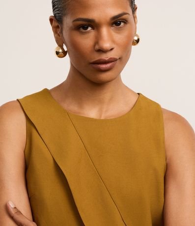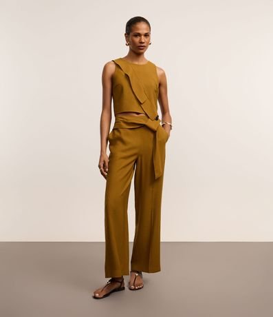 Blusa cropped sem manga, confeccionada em vicose certifica mais sustentável, corte alfaiatado e com detalhe transpassado com babado na frente.