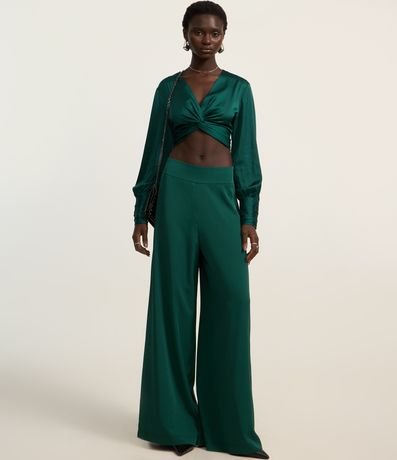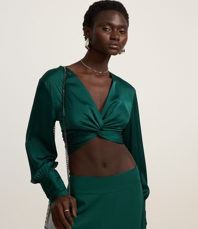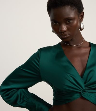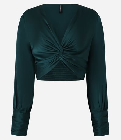 Blusa cropped acetinada com nózinho no busto, manga longa com punhos drapeados e botão forrado.