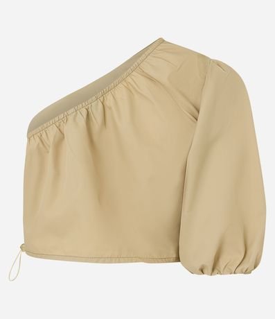 Blusa cropped feminina, alfaiatada, com ombro só, manga bufante, sem estampa e com elástico ajustador na barra.