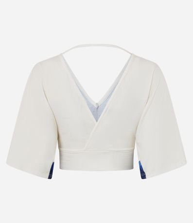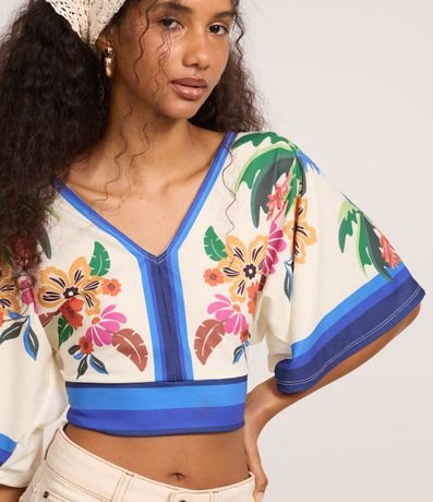 Ref: Blusa feminina cropped em decote v com mangas curtas amplas e estampa floral.