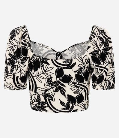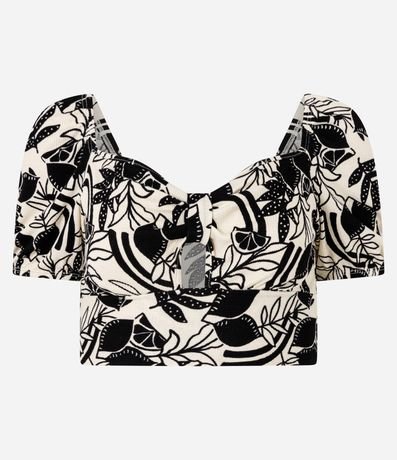 Ref: Blusa cropped feminina curta com decote coração, lacinho frontal, manga curta bufante. Peça em ribana com estampa de limoeiro.