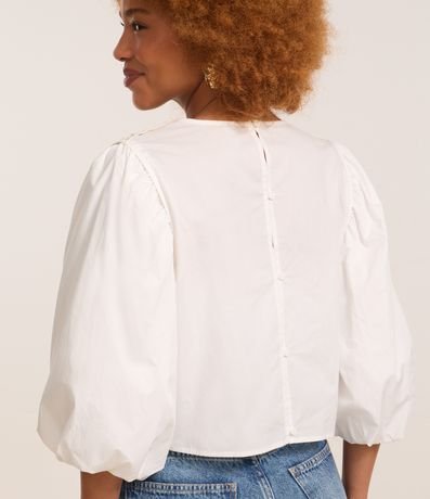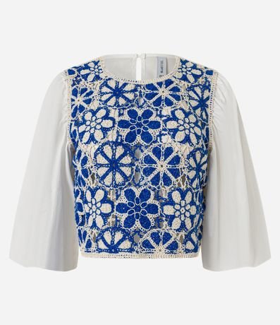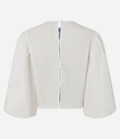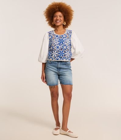 Ref: Blusa feminina cropeed confeccionada em algodão certificado bci, gola redonda, manga bufante e estampa frontal com efeito crochê estilo colete, detalhe de abotoamento nas costas.
