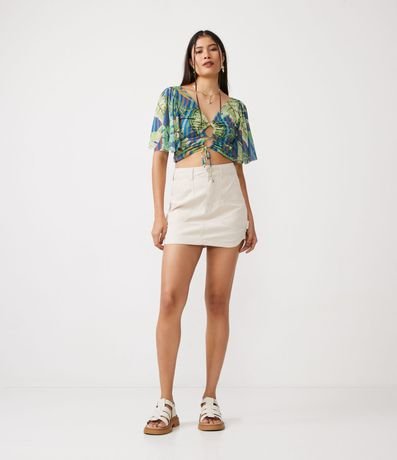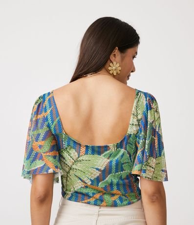 Ref: Blusa cropped com decote V, mangas godês, costas decotadas, vazados no busto com amarração e estampa de folhagens.