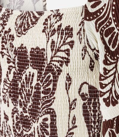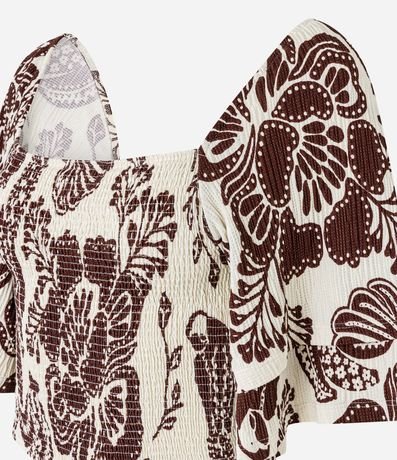 Ref: Blusa feminina confeccionada em viscose certificada e elastano, peça no modelo cropped com decote reto, manga curta larga e lastex. Peça contém estampa floral bicolor e textura.
