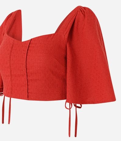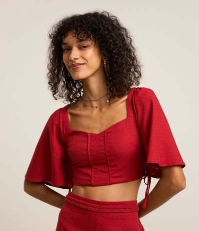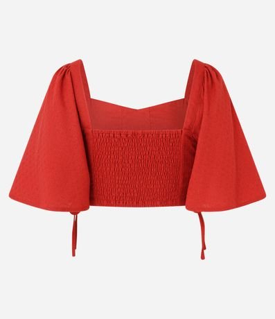 Ref: Blusa cropped com manga curta ampla, textura maquinetada, amarração na lateral e lastex nas costas.