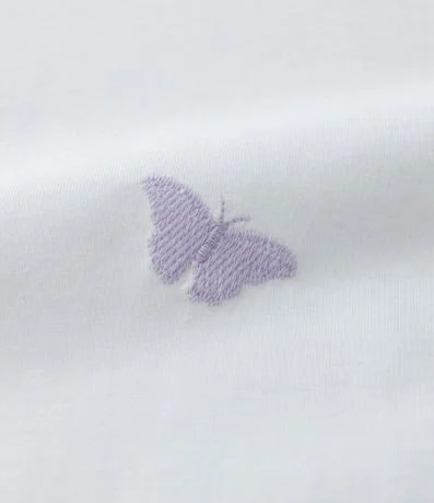 Ref: Blusa infantil de modelo comfort, comprimento curto, com gola redonda e mangas curtas. É confeccionada em algodão e possui estampa bordada de borboletas.