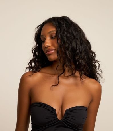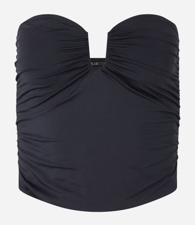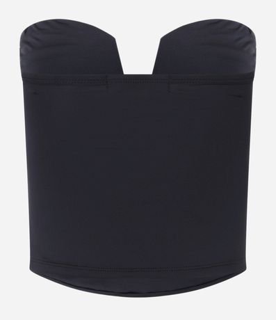 Cropped corsetado com recorte v no busto, decote tomara que caia e com franzidinhos.