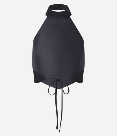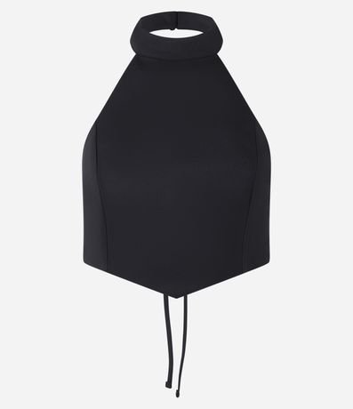 Blusa cropped com decote halter, golinha alta com fechamento no pescoço, em alfaiataria e com amarração nas costas abertas.