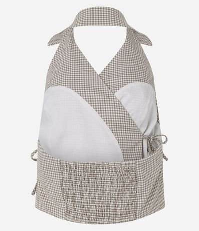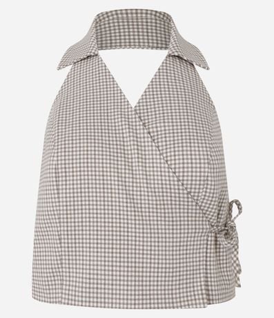 Blusa cropped sem manga com golarinho, decote v transpassado, amarração na lateral e estampa xadrez.