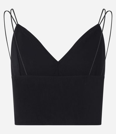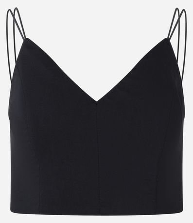 Blusa feminina confeccionada em bengaline, de modelo cropped, com alças finas e duplas.