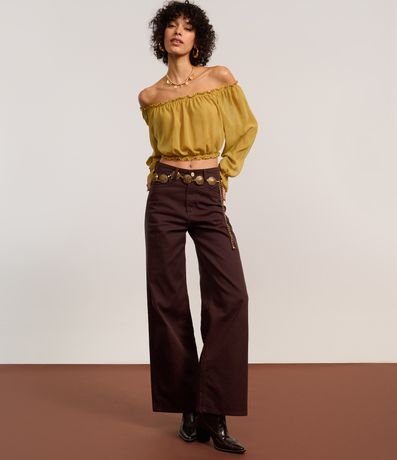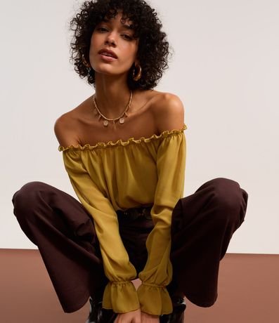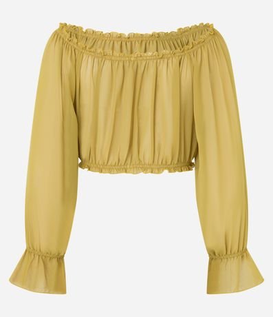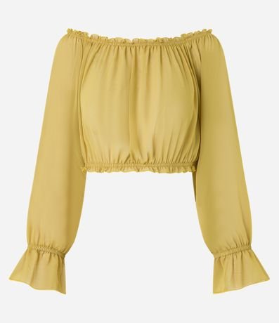 Ref: Blusa cropped com manga longa, confeccionada em chiffon com babadinhos nos punhos e elástico na barra.