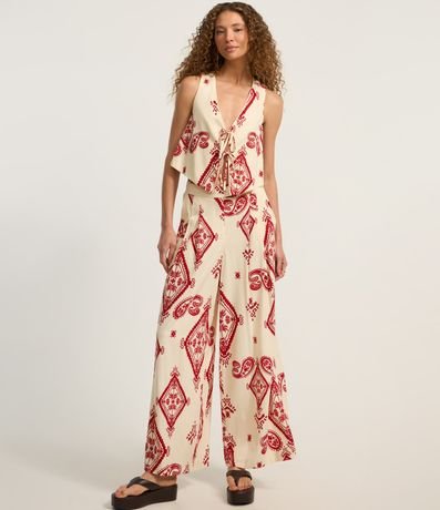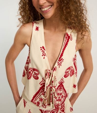 Blusa feminina de modelo cropped colete, com amarrações frontais, sem mangas e estampa paisley. A peça confeccionada em viscose certificada com linho, possui inspiração no estilo folk, super tendência.