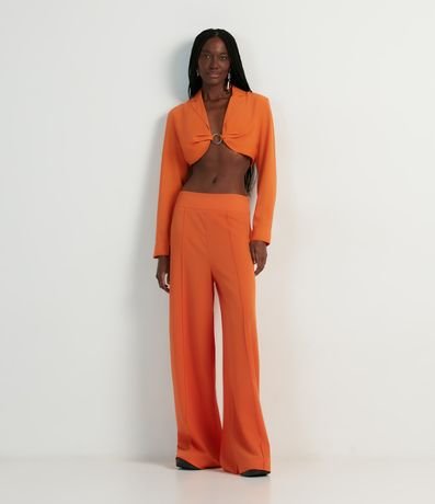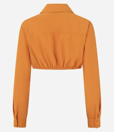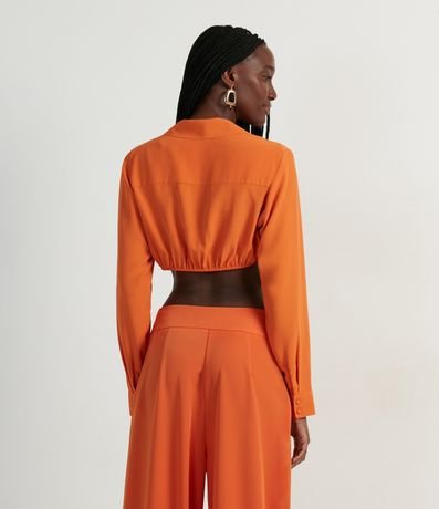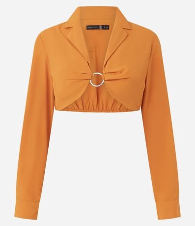 Blusa curta em crepe com colarinho na gola, mangas longas e franzidos nas costas. O glamour do fit fica por conta da sua modelagem mais curtinha além da sua abertura ficar suspensa por uma argola no busto.