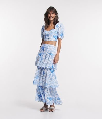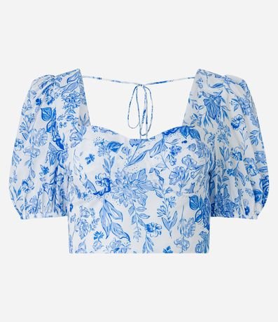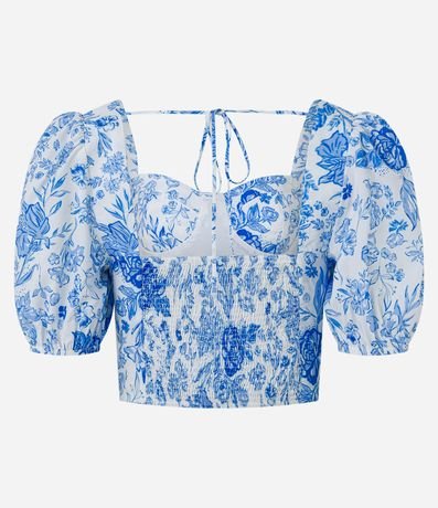 Ref: Blusa em crepe, com decote coração, mangas curtas bufantes, lastex nas costas e estampa floral.