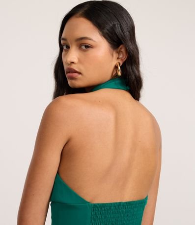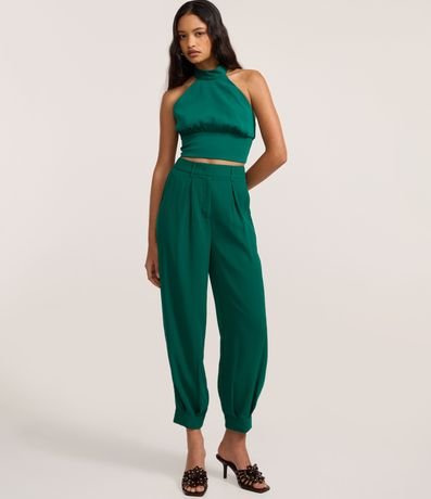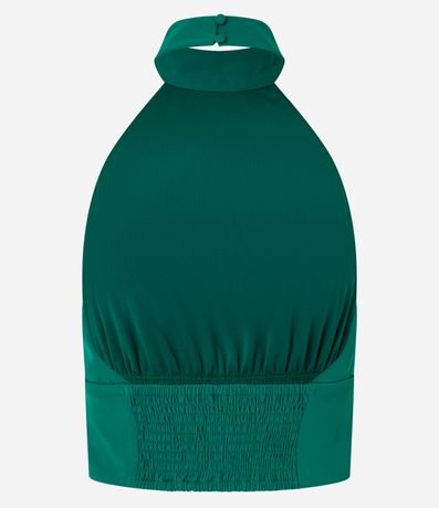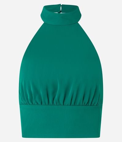 Blusa cropped com decote halter, golinha alta com fechamento no pescoço e preguinhas na cintura.