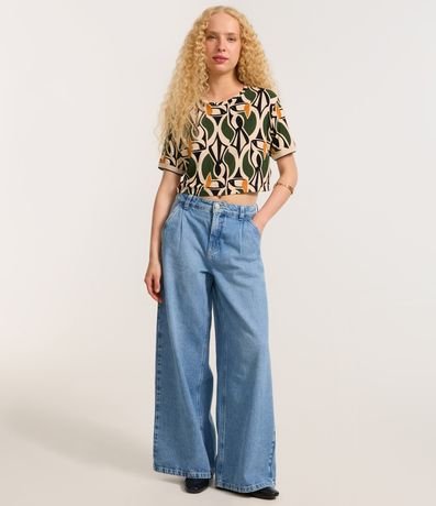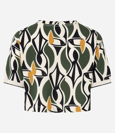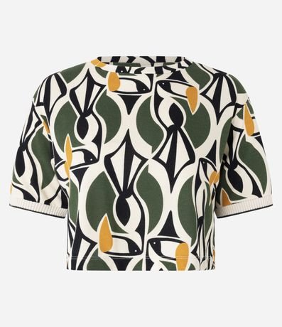 Ref: Blusa manga curta com detalhe em retilínea, confeccionada em crepe com viscose certificada, estampa geométrica e comprimento cropped.