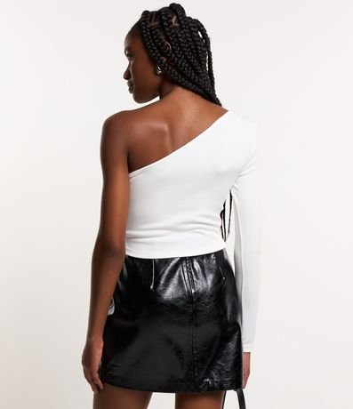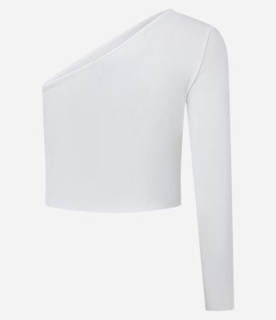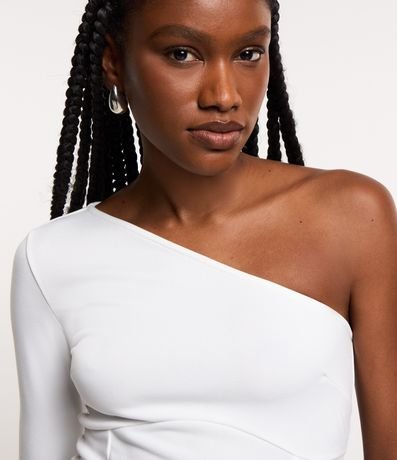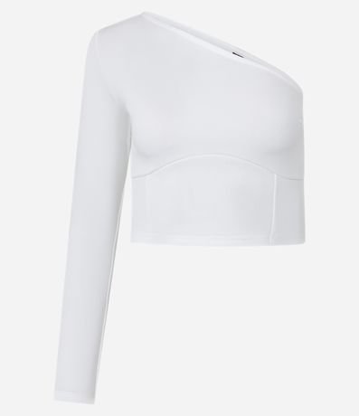 Blusa cropped, com decote um ombro só, manga longa, confeccionada em crepe e com recorte abaixo do busto.