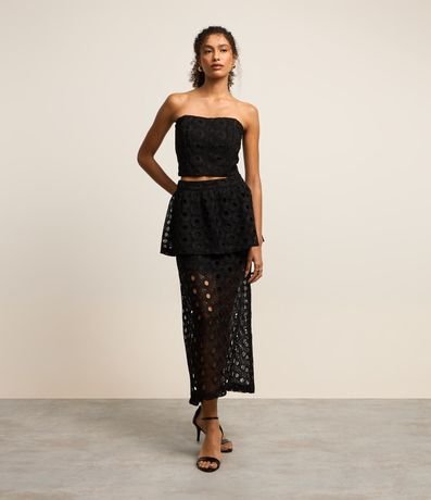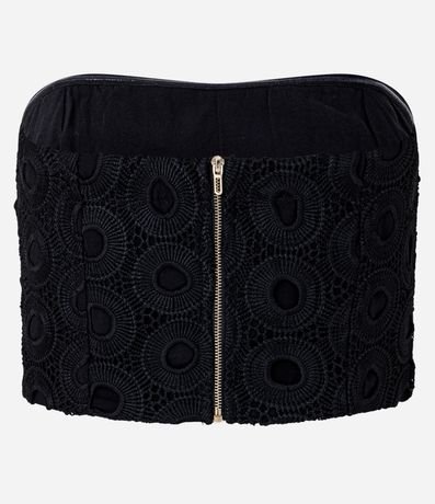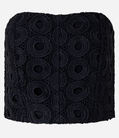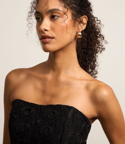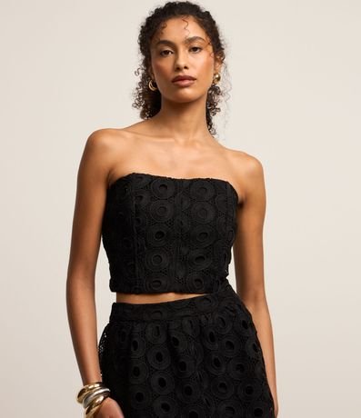 Ref: Blusa tomara que caia, confeccionada em guipure, texturizada e fechamento por zíper tratorado nas costas.