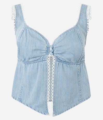 Ref: Blusa cropped, em jeans, com alças largas, botões no busto. Peça tem abertura central e alças com bordados picotados nas extremidades. Este produto possui material mais sustentável em sua composição, sendo ambientalmente mais responsável.