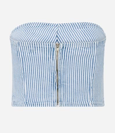 Blusa cropped em jeans com estampa de listras e decote tomara que caia.