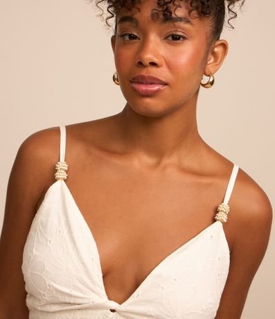 Blusa feminina modelinho cropped, com alças finas e reguláveis e com detalhe em aviamentos. Possui decote em V e textura floral.
