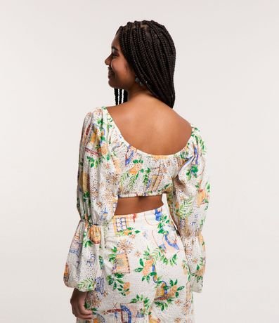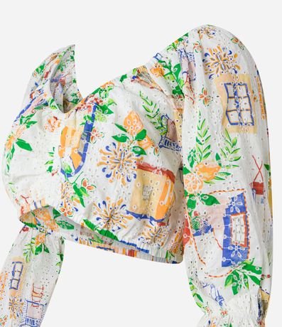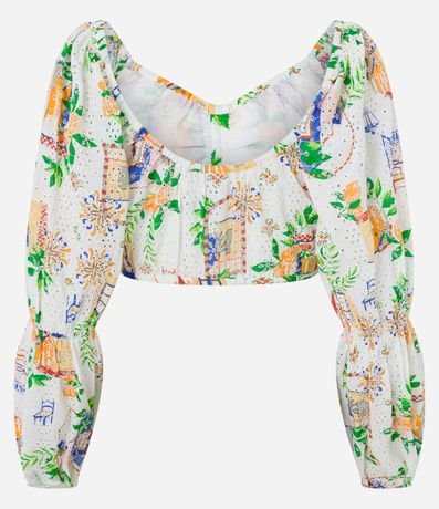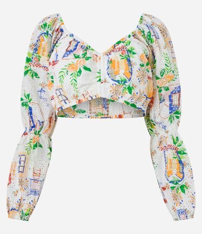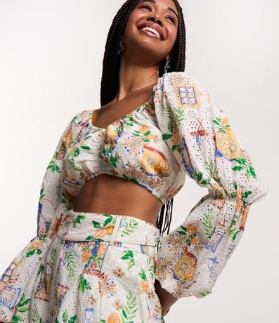 Ref: Blusa cropped de mangas longas confeccionada em laise com decote V, tecido com furinhos, elástico no meio da manga mais estampa com um mood da cidade de Servilha.