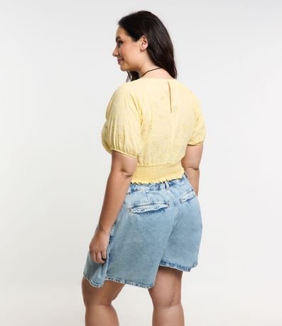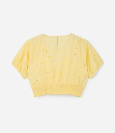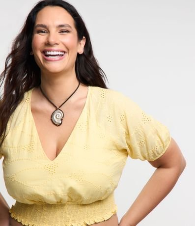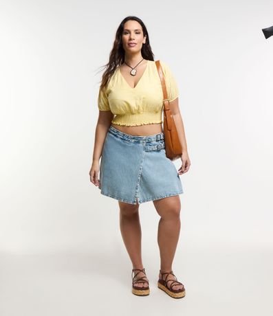 Ref: Blusa de laise, modelo cropped, com devote V, mangas curtas, punhos elásticos e lastex na barra.