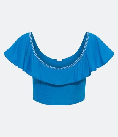 Blusa cropped, em linho, com babadinho nas mangas e busto, pespontos contrastantes e sem estampa.