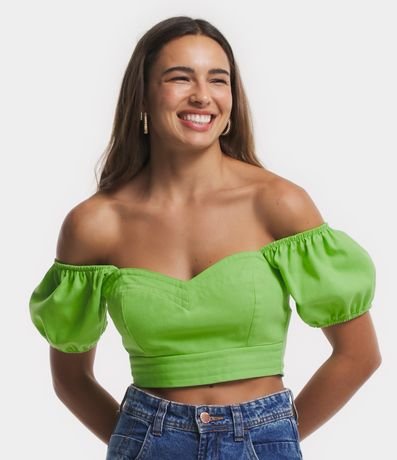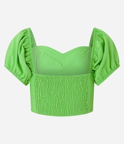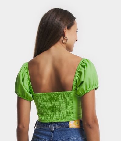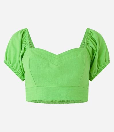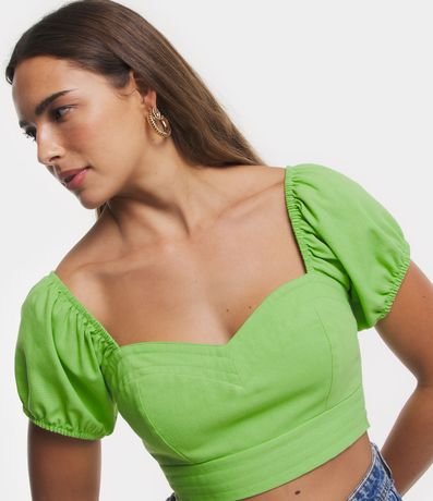 Ref: Blusa cropped com decote coração e manga curta bufante. A peça que não possui estampa, apenas detalhes de perpontos, pode ser combinada em diversos looks descontraídos. Suas mangas são tendência e trazem muita atualidade ao look.