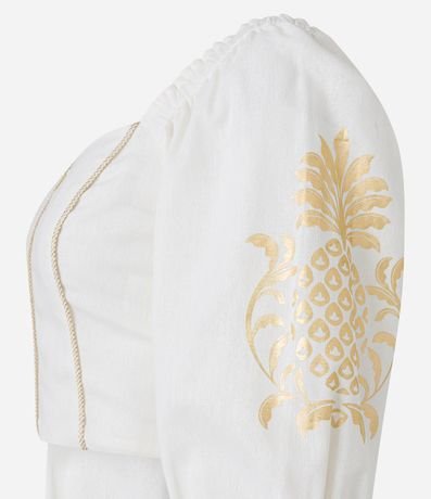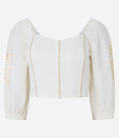 Blusa cropped feminina, confeccionada em viscose e linho, com decote coração, mangas 3/4 bufantes e estampa metalizada.