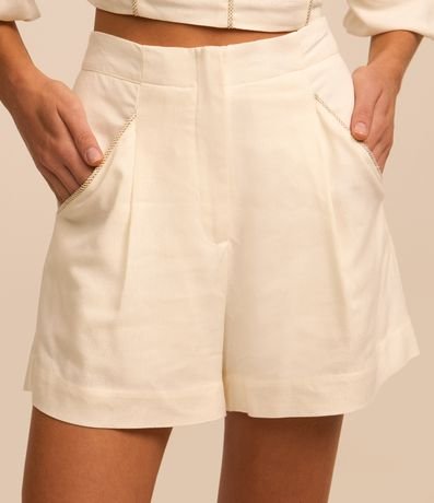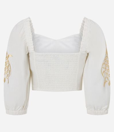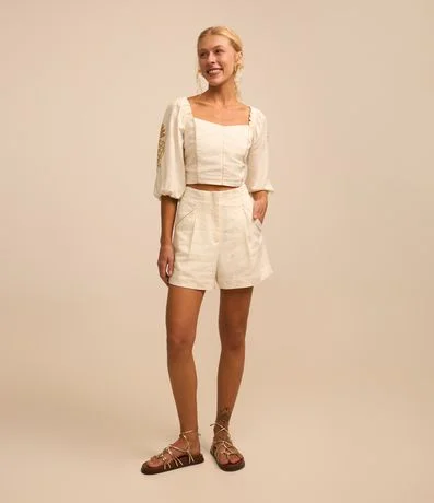 Blusa Cropped em Linho com Manga Bufante e Detalhe Metalizado
