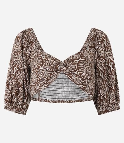 Ref: Blusa cropped de mangas curtas confeccionada em linho e viscose com decote coração, busto torcido e lastex nas costas. Possui mangas curtas e com elásticos nos punhos e coqueiros estampados por toda a peça.