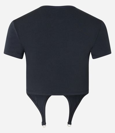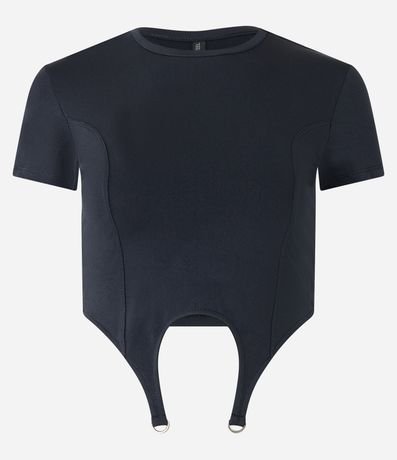 Ref: Blusa cropped, manga curta, em meia malha com barra assimétrica e fivelas em metal.