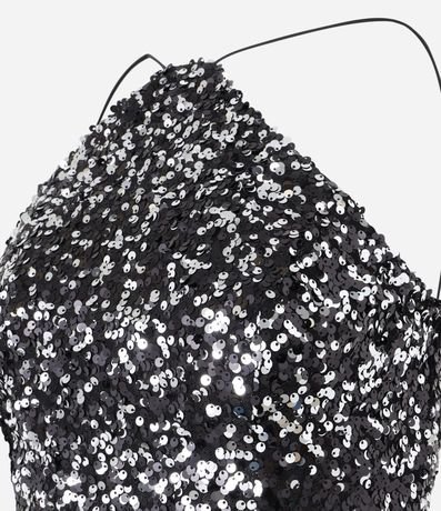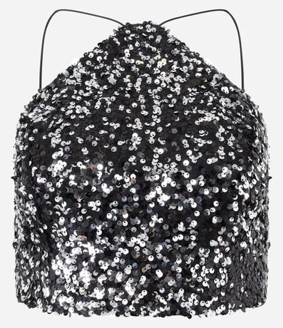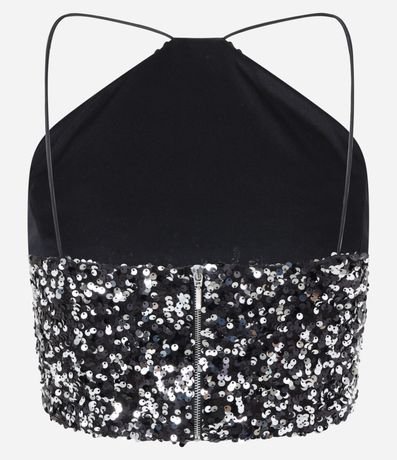 Blusa cropped com alcinha fina, decote halter com base em veludo e com paetês metalizados.