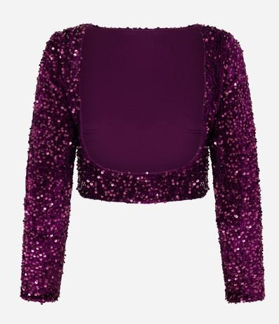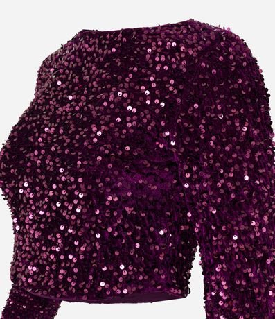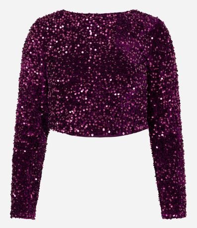 Blusa cropped com manga longa com base em veludo e com paetês. Possui decote nas costas.