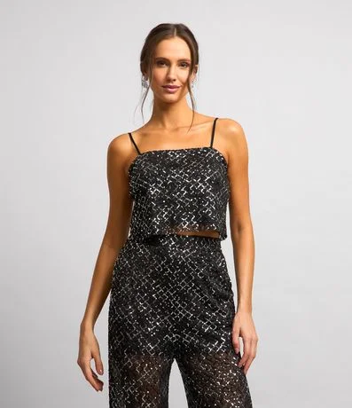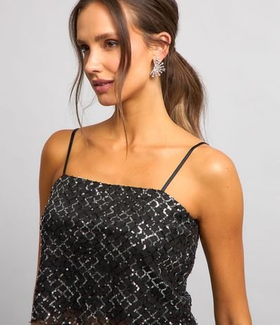 Blusa cropped com alcinhas finas, confeccionada em paetês metalizados e com efeito geométrico.