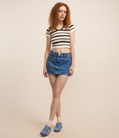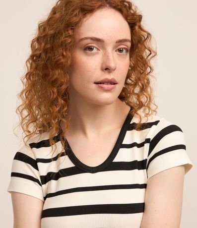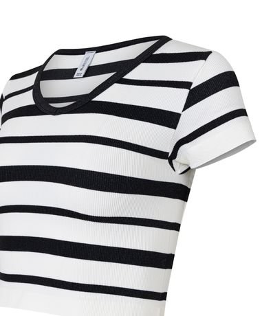 Ref: Blusa cropped com manga curta, confeccionada em poliamida seamless, decote v contrastante e listras.