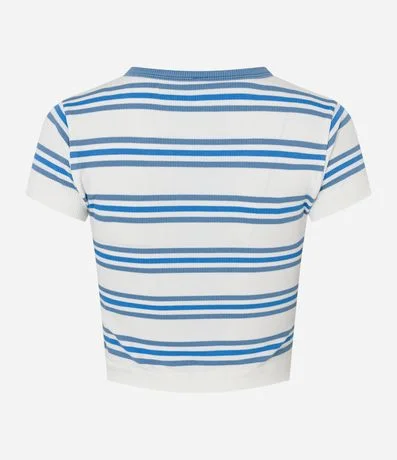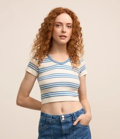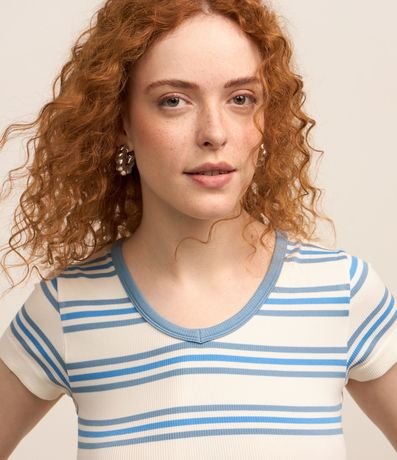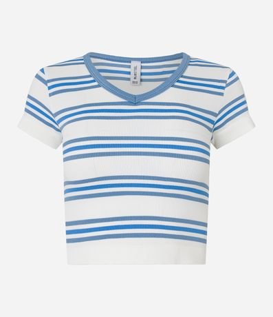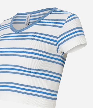 Blusa cropped com mangas curtas, confeccionada em poliamida seamless, decote v contrastante e listras duplas.