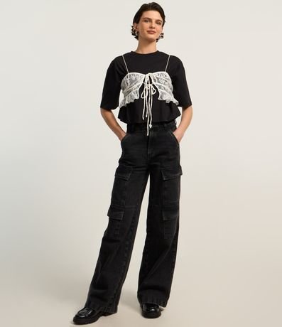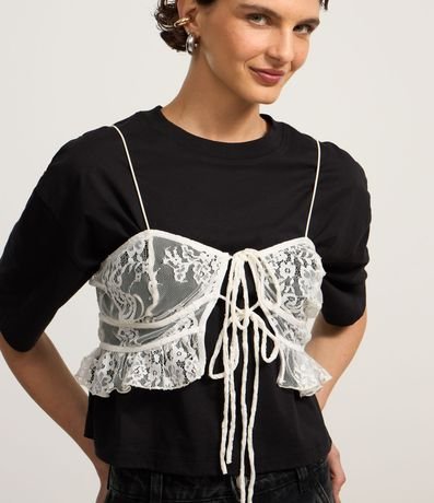 Blusa Cropped em Renda com Alça Rabo de Rato e Babado na Barra