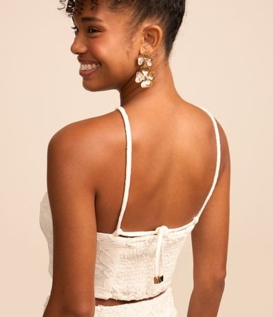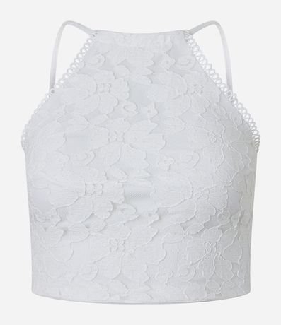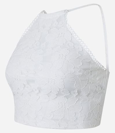 Ref: Blusa cropped com gola americana, alças finas com amarração na costas, lastex e confeccionada em renda.