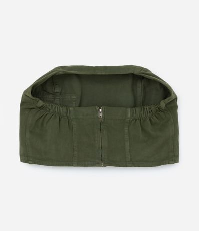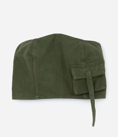 Blusa cropped confeccionada em sarja, sem alças e fechamento com zíper nas costas. Possui elástico nas costas e bolso cargo.