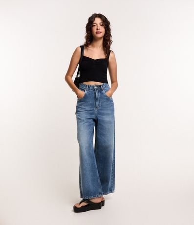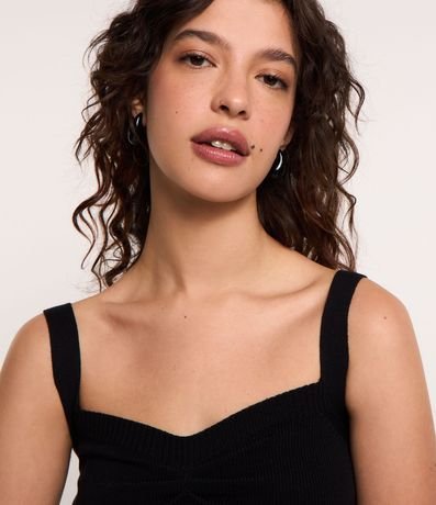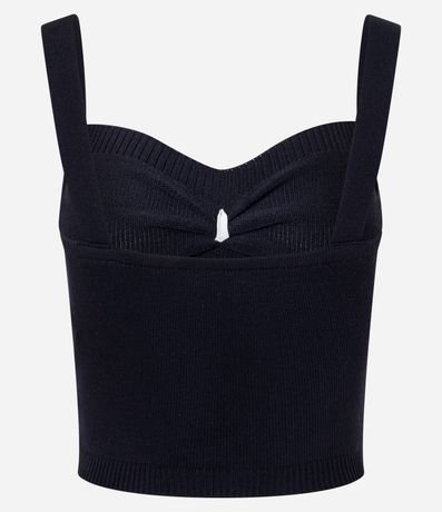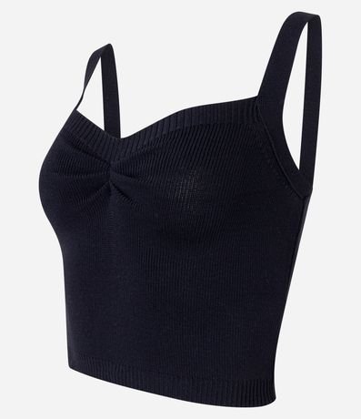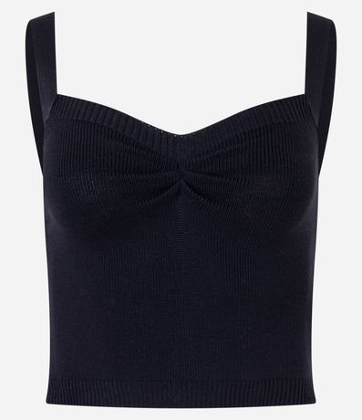 Blusa cropped, decote coração com puxadinho no busto, alças largas e confeccionado em tricô leve.