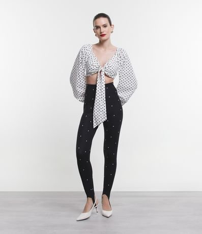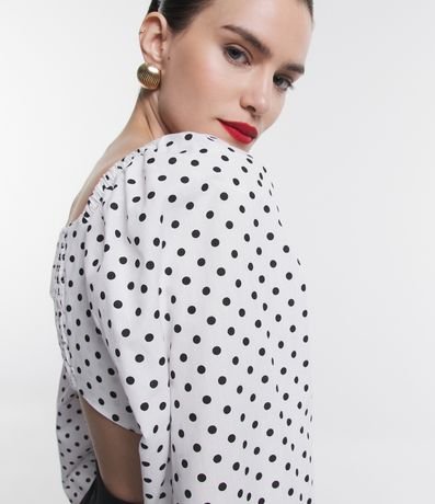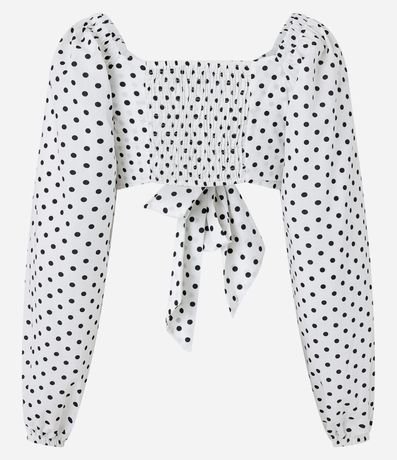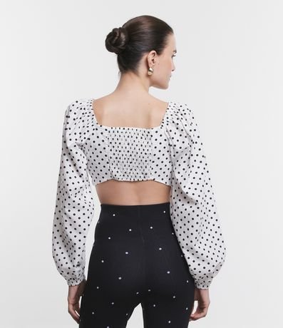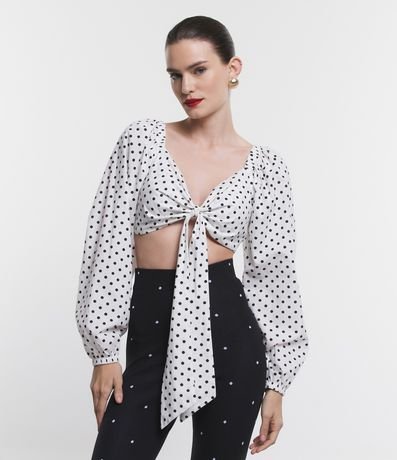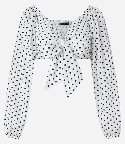 Ref: Blusa cropped, amarração frontal, manga longa bufante, estampa poá e lastex nas costas.