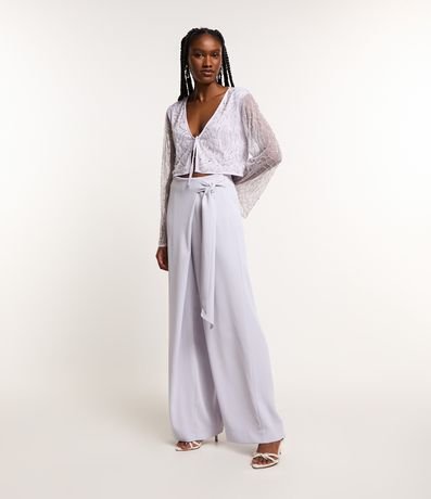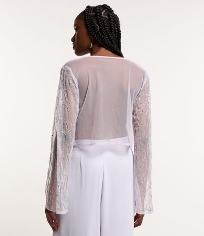Blusa cropped confeccionado em tule, manga longa flare e com transparência, amarração no busto e bordados com brilhos.