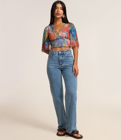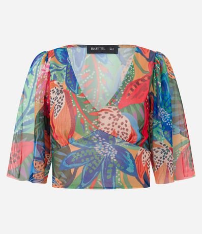 Ref: Blusa feminina em tule no modelo cropped com decote em v, manga curta e estampa floral.